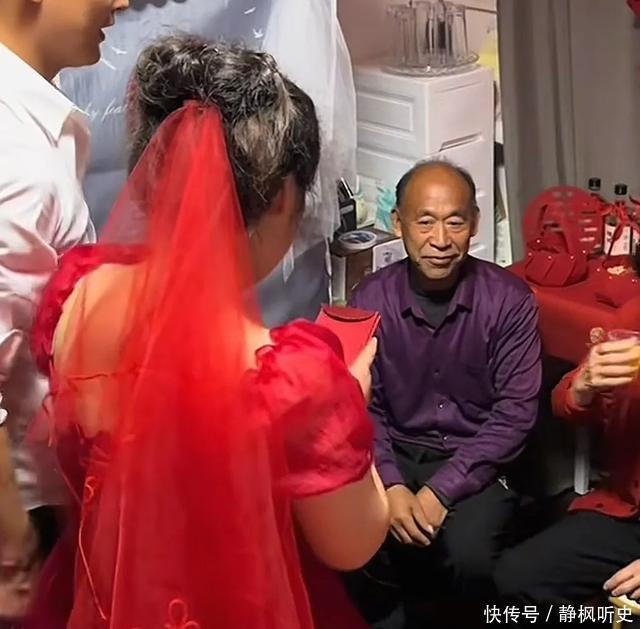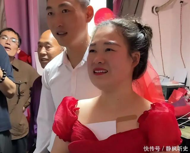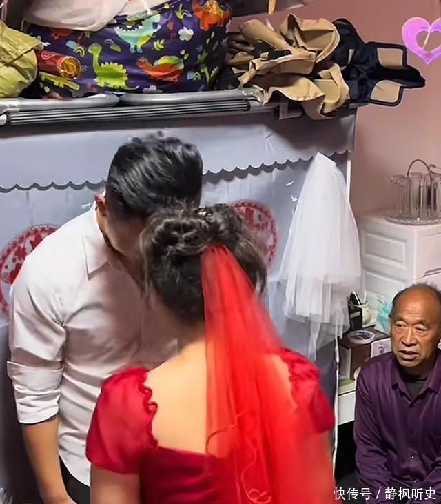 两人穿着的婚纱西服也合不合身,据说是租借婚庆公司的,小玉为了防止走光还特地用卫生纸遮住。